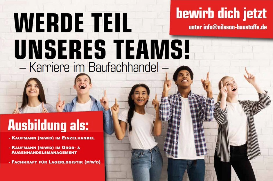 Mehr denn je legen wir bei Nilsson Baustoffe großen Wert auf die Ausbildung junger Menschen um Ihnen die ganze Vielfalt des heutigen Baustoffhandels näher zu bringen. Seit unserer Gründung vor über 70 Jahren blicken wir auf weit mehr als 100 Auszubildende zurück, einige davon sind noch Heute im Betrieb und Blicken mittlerweile auf über 40 Jahre im Nilsson-Team. Diese lange Zusammenarbeit mit unseren Mitarbeitern und die familiäre Atmosphäre ist das, was unsere Kunden und die Auszubildende bei uns so schätzen.